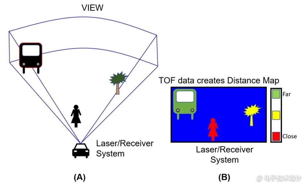 激光雷達係統的基本要素包括方波發射係統、目標環境,以及用來解釋環境中外部元素距離的光接收器係統。激光雷達傳(chuan) 感方法是采用脈衝(chong) 激光形式的光,通過分析返回信號的飛行時間(ToF)來測量範圍的(圖2)。