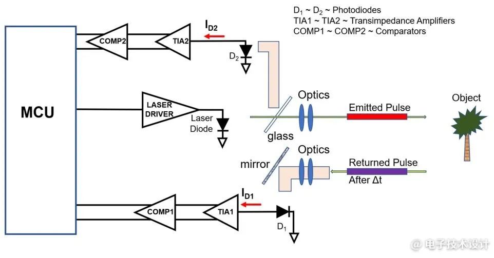 數字光信號脈衝(chong) 射到對象後會(hui) 反射回光學係統。返回的脈衝(chong) 會(hui) 鏡像到第二個(ge) 光電二極管D1。D1信號路徑的電子部分與(yu) D2信號路徑相同。兩(liang) 個(ge) 信號到達微控製器(MCU)後即可計算出飛行時間。