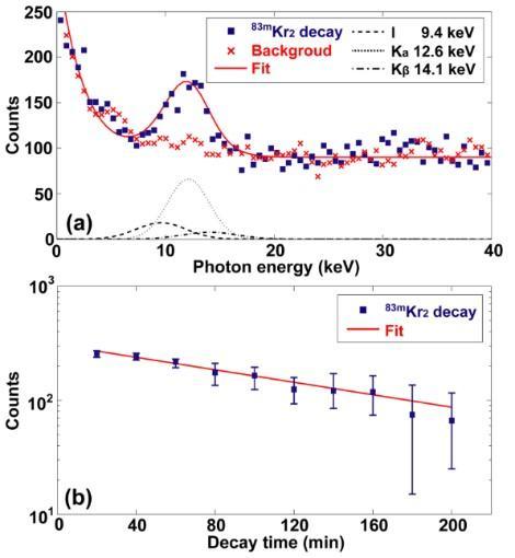圖 2. (a) 同質異能態退激釋放的X射線譜;(b) 隨時間衰變的產(chan) 額及半衰期擬合。
