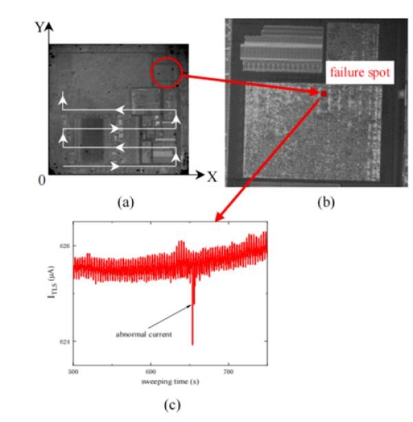 圖2.利用激光熱激發缺陷定位裝備定位的某單片機失效點(a)背部紅外相機成像示意圖(b)失效點的具體(ti) 位置(c)掃描過程中電流的變化情況