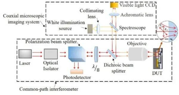 在傳(chuan) 統的EOFM技術基礎上,科研團隊提出了一種新的基於(yu) 同軸顯微鏡的定位集成電路內(nei) 部功能單元的頻率映射方法,自主搭建了集成電路缺陷檢測電光探針測試裝備,如圖3所示。目標電路以設定工作頻率工作,通過分析反射激光的頻率特性,準確定位目標電路功能區域及可能的缺陷位置。研究提出的同軸顯微鏡設計提供了良好的光斑質量和信噪比,可定位工作電流低至10