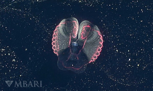 圖 1:Bathochordaeus stygius,一個(ge) 巨大的幼蟲,在它的粘液房中,被 DeepPIV 激光片照亮。版權所有 Kakani Katija / MBARI。