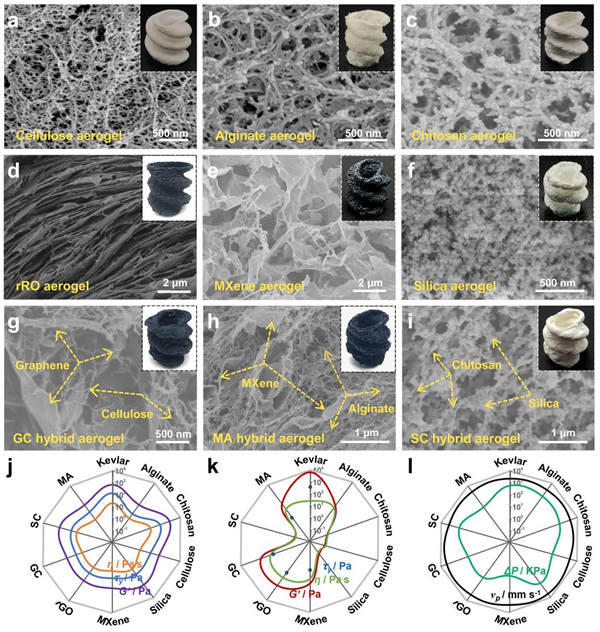 通過使用相應的前驅體(ti) 墨水,上述MSP策略可以推廣到其他氣凝膠的構築,包括有機(纖維素、海藻酸鹽、殼聚糖)、無機(石墨烯、MXene、二氧化矽)和無機-有機(石墨烯/纖維素、MXene/海藻酸鹽、二氧化矽/殼聚糖)複合氣凝膠。所有3D打印的氣凝膠都顯示出良好的螺旋形狀,內(nei) 部具有豐(feng) 富的多孔結構,驗證了MSP策略的普適性。該方法打破了傳(chuan) 統基於(yu) 擠出的直寫(xie) 成型技術對墨水流變性能的嚴(yan) 格要求,拓展了可打印材料的種類。