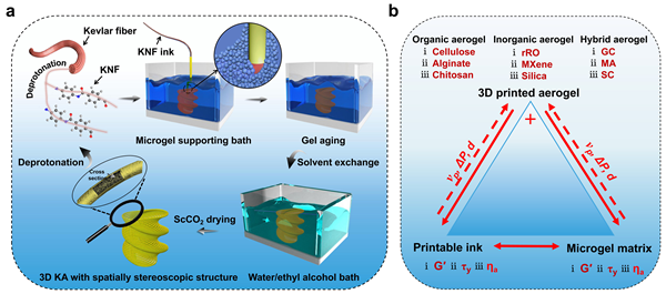 鑒於(yu) 此,中國科學院蘇州納米技術與(yu) 納米仿生研究所研究員張學同團隊開發了一種通用的微凝膠輔助懸浮打印(MSP)策略,用於(yu) 按需構築各種具有任意立體(ti) 結構的介孔氣凝膠。作為(wei) 概念證明,研究采用去質子化的凱夫拉納米纖維(KNF)分散液為(wei) 墨水,選用合理設計的微凝膠作為(wei) 輔助基質,通過基於(yu) 擠出的3D打印技術,將KNF墨水按預先設定的結構逐層沉積到微凝膠基質中,經基質去除、溶劑交換和超臨(lin) 界CO2幹燥,獲得了由隨機纏結納米纖維組成的3D打印Kevlar氣凝膠(3D-KA)。在MSP策略中,可打印墨水的儲(chu) 能模量(G′)、屈服應力(τy)和表觀粘度(ηa)必須相互匹配,以確保墨水順利從(cong) 噴嘴擠出;相應微凝膠基質的G′、τy和ηa也要相互匹配,以確保針頭的穩定移動和對打印線條的承載;針頭的內(nei) 徑(d)、擠出壓力(ΔP)和打印速度(νp)也對打印線條的尺寸和形貌具有重要影響。此外,MSP策略實施前還需要將某些特定的墨水溶膠-凝膠轉變因素,如pH值、溫度、化學成分,預加載到相應的微凝膠基質中,以促進墨水的成型。