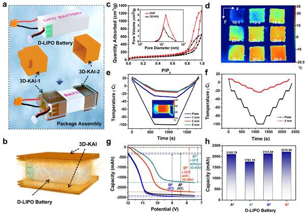 為(wei) 驗證基於(yu) MSP策略製備的凱夫拉氣凝膠的實際應用,研究人員通過合理的工程設計定製了Kevlar氣凝膠絕熱組件(3D-KAI)。由於(yu) 氣凝膠固有的隔熱性能和Kevlar的極端耐高低溫特性,該3D-KAI顯示出優(you) 異的低溫防護性能,在-30℃下,安裝有定製3D-KAI的無人機電池(D-LIPO)放電容量為(wei) 2217 mAh,比未安裝3D-KAI的D-LIPO高26%(放電容量為(wei) 1761 mAh),這表明電池可以得到有效保護,以確保其在惡劣環境下的正常放電。由MSP策略定製的3D-KAI可以準確複製實際設備的多尺度架構,並解決(jue) 電池在低溫下運行時容量下降的問題,可擴展到氣凝膠在其他隔熱保溫環境的應用。