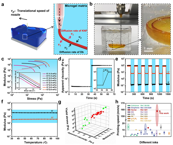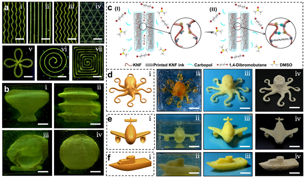 在MSP策略實施過程中,沉積在微凝膠基質中的KNF墨水立即進行部分溶膠-凝膠轉變,基質可臨(lin) 時支撐未完全凝膠化的KNF線條直至其完全凝膠老化。研究發現,利用二甲基亞(ya) 碸(DMSO)和卡波姆(Carbopol)的分散-質子化凝膠作用,以及1,4-二溴丁烷(Db)的化學交聯作用,Db可在KNF的氮負離子位點進行取代反應,從(cong) 而在相鄰KNF線條間形成共價(jia) 烷烴鍵,促進相鄰KNF打印線條之間的粘附力,進而保證結構的完整性。此外,在針頭直徑一定的情況下,墨水的擠出速率(νe)、針頭的移動速率(打印速度,νp)、基質中KNF(ν1)和Db(ν2)的雙擴散速率共同影響著KNF打印線條的形態和直徑。由於(yu) MSP策略中微凝膠基質的輔助作用,擠出打印方法對墨水的流變性要求不嚴(yan) 格,打印速度大大提高(高達167 mm s-1),遠高於(yu) 文獻報道的打印速度(通常小於(yu) 20 mm s-1),提高了製備效率。