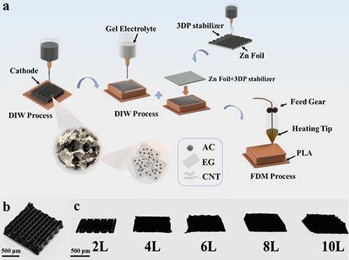 近日,我所催化基礎國家重點實驗室二維材料化學與(yu) 能源應用研究組(508組)吳忠帥研究員團隊,提出了通過油墨直寫(xie) 成型和熔融沉積成型兩(liang) 種3D打印方法,構建全打印可定製水係鋅離子雜化電容器的新策略。團隊利用該策略,構築了具有分級多孔結構的高麵容量正極,以及無枝晶穩定結構的鋅金屬負極,製備出高比能、長循環穩定的鋅離子雜化電容器。