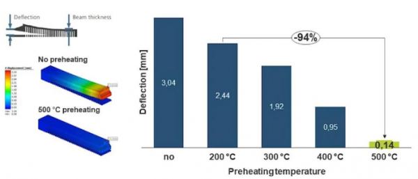 △圖1:與(yu) 200 攝氏度的行業(ye) 標準相比, 500 攝氏度的預熱可以減少約 95% 的撓度(在懸臂上測量)