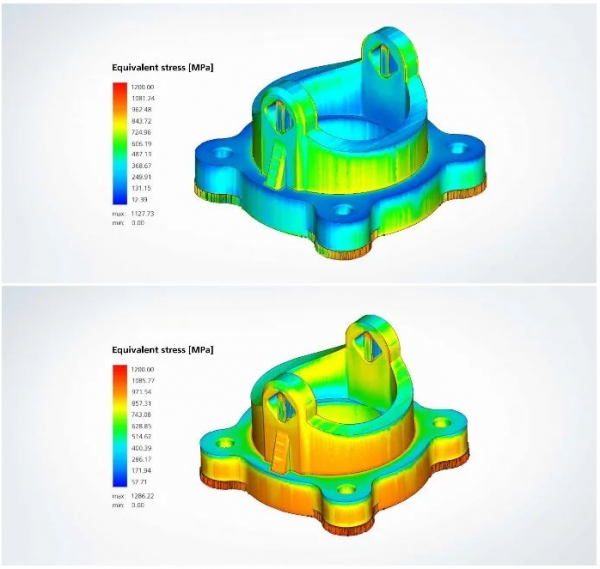 △圖2:如果一個(ge) 部件在 500 攝氏度的預熱下進行 3D 打印, Ti6AI4V 部件中的殘餘(yu) 應力就會(hui) 大大降低(上)。這為(wei) 設計開辟了全新的可能性,特別是在生產(chan) 體(ti) 積跳躍的更大規模的部件時。在 200 攝氏度時,殘餘(yu) 應力明顯增加(下)。這導致了更高的準備和後處理工作,因為(wei) 需要更多的模擬和支持設計。