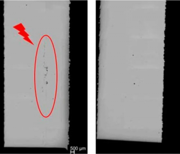 △圖3:(左)在 1.2343 和 200 攝氏度的預熱下出現裂紋;(右)在 500 攝氏度時無裂紋。在後續步驟中,剩餘(yu) 的小缺陷可以通過退火來糾正。