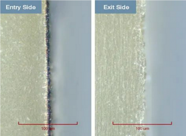 圖 1. 用綠光皮秒脈衝(chong) 切割的 FR4 板(厚度為(wei) 200 µm)的入射麵(左)和出射麵(右)視圖