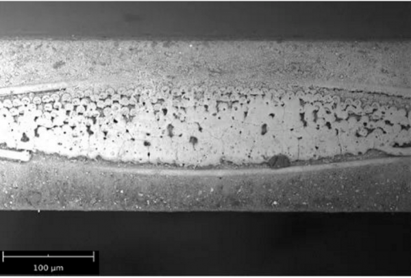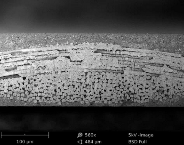 SEM 圖像顯示,使用 50% 的激光功率時,側(ce) 壁燒蝕程度非常低。優(you) 異的質量具有顯而易見的明確指標,如個(ge) 別纖維端麵可檢測到無熔化 / 低熔化,層間無分層,銅線燒蝕程度低,且銅線內(nei) 及周圍無熔化或變形。