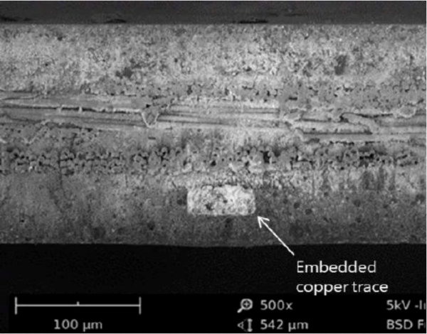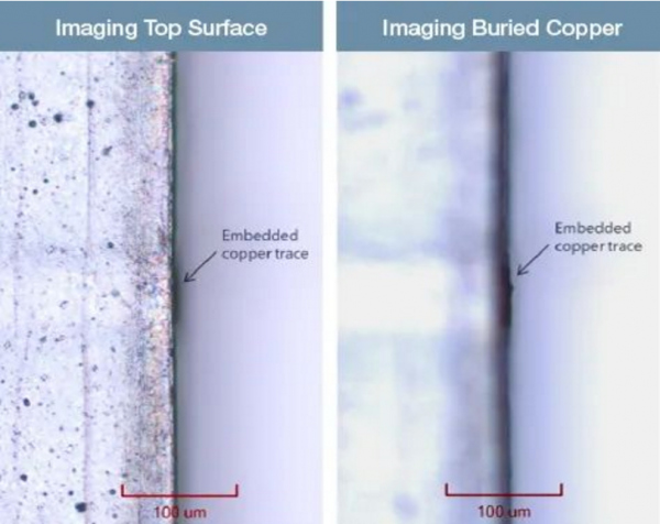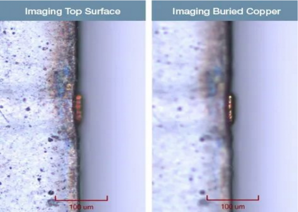 結果表明,這樣的做法頗有成效。在全功率運行激光器以進行高速加工的情況下,切割入射麵的俯視顯微鏡照片(圖 4)表明,內(nei) 嵌銅線確實對切割質量有一定的影響。雖然表麵質量總體(ti) 優(you) 秀,切邊質量良好,並且僅(jin) 有一個(ge) 小的碎片區,但有證據表明,銅層周圍的過度加熱導致其周圍的聚合物 FR4 材料被輕微侵蝕,從(cong) 而導致銅線從(cong) 側(ce) 壁輕微突出。該工藝的有效切割速度為(wei) 57 mm/s。