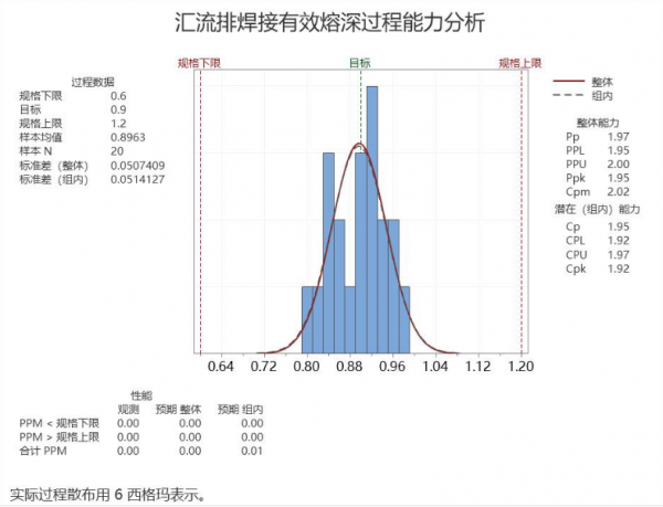 焊接1 係鋁鈀片到方形鋰電池極柱上方,要求表麵外觀無焊渣飛濺、裂紋、氣孔、虛焊等不良現象,焊接熔深達到0.6—1.2mm,熔寬 1.5-2.5mm實際測試20組數據,熔深大都集中在0.7— 1.0之間,過程能力Cpk為(wei) 1.92,滿足焊接實驗要求。