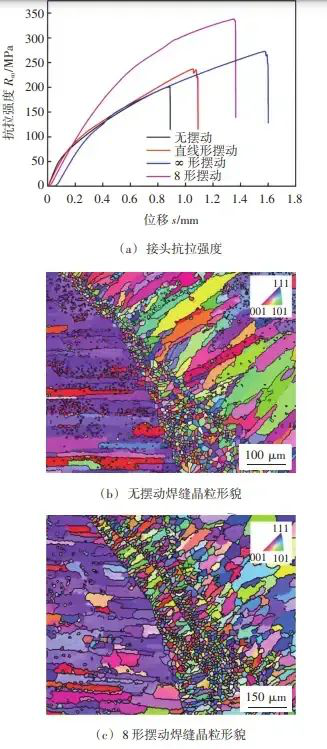在優(you) 化焊接工藝的基礎上,采用激光擺動模式(擺動可以有效降低熱輸入又不減少功率密度)對於(yu) 鋁合金接頭強度的影響。在常用的直線形擺動、∞形擺動和8形等模式中,8形擺動的焊接接頭具有最高的抗拉強度,同時其焊縫區域晶粒明顯細化,如圖 7 所示。