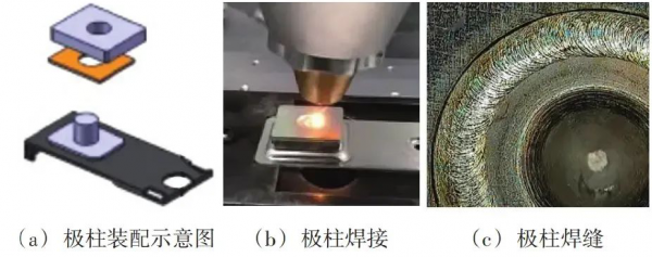 激光熱源能量密度高、柔性高且可達性好,非常適合小尺寸電池零部件的加工。對於(yu) Al-Cu合金高反射率的問題,利用小型脈衝(chong) 激光的高峰值功率可實現薄板零件的高質量連接 。激光焊接技術廣泛用於(yu) 動力電池的殼體(ti) 、防爆閥、匯流排等零部件的加工過程 ,如圖3所示。