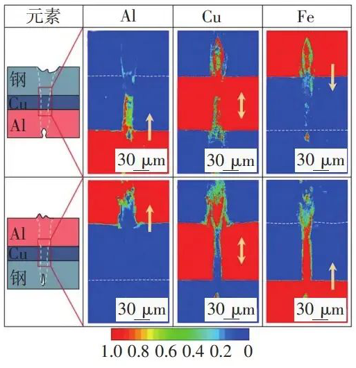 圖17 中間調控元素Cu對Al-Fe接頭元素分布的影響