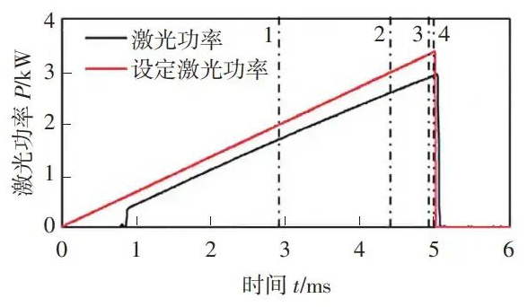 過燒缺陷出現的原因是鋁合金對激光反射率高, 生產(chan) 時往往采用較高的激光功率,而防爆閥的厚度太小,很容易熔穿(熱輸入過大) 。其解決(jue) 方案通常是選擇合適的焊接工藝參數,控製熱輸入。采用帶有前置尖峰並以指數形式衰減的波形,通過前置尖峰可以提高鋁材對激光的吸收率,而後續的指數衰減波可防止功率密度過高導致的穿孔,如圖9所示(另外也可以提高光束質量)。
