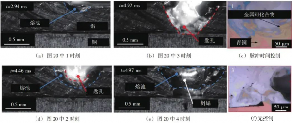 除了可以代替人工完成焊接,智能化技術還能進一步幫助控製焊接過程,提升焊接質量 。動態監測 Al-Cu 搭接接頭脈衝(chong) 激光焊接的等離子體(ti) 發射光譜,依據光譜信息確定界麵處鋁銅元素的混合情況 (激光在線監測係統也可以去看看)。脈衝(chong) 激光焊接時間的閉環控製過程如圖20和圖21所示,利用反饋係統動態控製激光器的脈衝(chong) 時間,在鋁銅界麵過度混合時立刻結束脈衝(chong) ,從(cong) 而減少界麵脆性金屬間化合物,提高接頭強度。