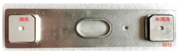 采用脈衝(chong) 激光直接輻射去汙,使其表麵溫度升高而發生熱膨脹,熱膨脹使汙染物或者基底振動,從(cong) 而使汙染物克服表麵吸附力脫離基底表麵從(cong) 而達到去除物體(ti) 表麵汙漬的目的。這種方式可以有效地去除電芯極柱端麵的汙物、粉塵等,為(wei) 電池焊接提前做準備,以減少焊接的不良品。
