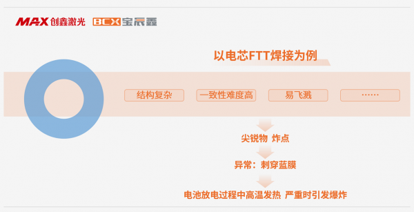 以創鑫激光新能源部門接觸到的某電芯FTT焊接項目為(wei) 例,由於(yu) 工件結構非常複雜,銅箔單層僅(jin) 有6μ,而層數卻共計有93層,焊接中需要把每一層都疊在一起,再焊在電池蓋板上。因為(wei) 其複雜的結構,傳(chuan) 統的激光焊接容易產(chan) 生大飛濺和炸點、尖銳物等異物,並很難做到表麵效果一致。異物極易引發刺穿藍膜的異常,從(cong) 而導致電池放電過程中高溫發熱,嚴(yan) 重時可能引起電池爆炸,為(wei) 此需要更先進的激光焊接工藝來完成此高難度的焊接需求。