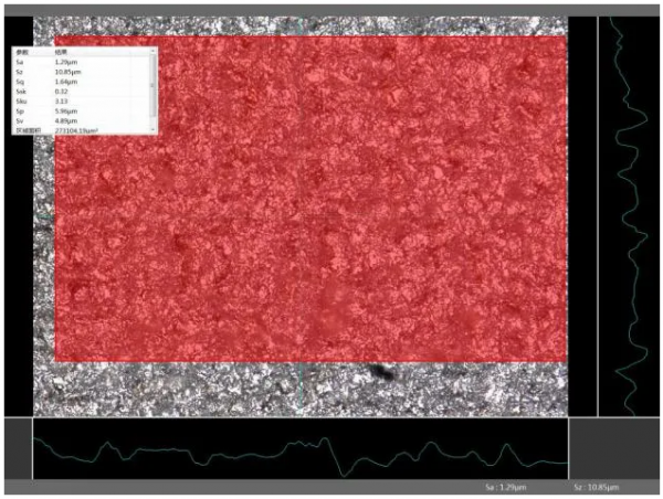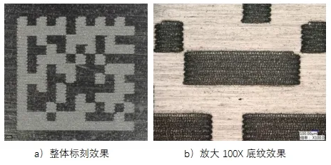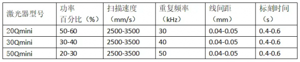 標刻二維碼首先需要保證二維碼的整體(ti) 輪廓清晰,通過調整開光延時和關(guan) 光延時可以實現。由於(yu) 激光標刻二維碼是由若幹單脈衝(chong) 光斑重疊形成的,振鏡掃描速度和激光重複頻率共同決(jue) 定了光斑的重疊率。隻有在合適的參數組合下達到一定的光斑重疊率才能標刻出有一定灰度或色彩的二維碼,所以在進行二維碼標刻試驗之前,首先要找到合適的掃描速度、重複頻率、填充線間距等參數。表3為(wei) 標刻尺寸8mm*8mm二維碼的推薦工藝參數,測試結果見圖4和圖5,可以看出脈衝(chong) 點可整體(ti) 均勻覆蓋標刻區域,粗糙度測試儀(yi) 結果顯示底紋粗糙度在1μm左右。表3 20/30/50Qmini激光器標刻二維碼推薦參數
