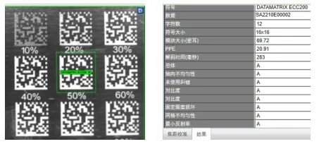 使用讀碼軟件對二維碼等級進行評定(圖6),結果為(wei) A級,滿足正常的應用需求。檢測條件對讀碼評定及其重要,環形照明形式效果優(you) 於(yu) 直條狀照明,同時對於(yu) 白色二維碼選擇白色光源效果較好,且光源的亮度需達到一定的值,才能使二維碼形成高對比度。