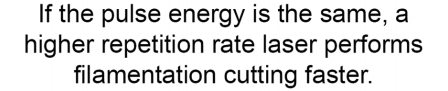 雷射重複頻率越高,光束在玻璃表麵上移動的速度就越快,從(cong) 而能夠以特定間距打孔。因此,對於(yu) 切割顯示器玻璃蓋板等大型零件來說,Coherent 的 HyperRapid NXT(重複頻率最高 400 kHz)的工作速度比 Rapid LX(重複頻率最高 90 kHz)快三倍,即使這兩(liang) 種雷射 每脈衝(chong) 輸出相同的能量,但 HyperRapid NXT 比 Rapid LX 更高頻率、速度更快。