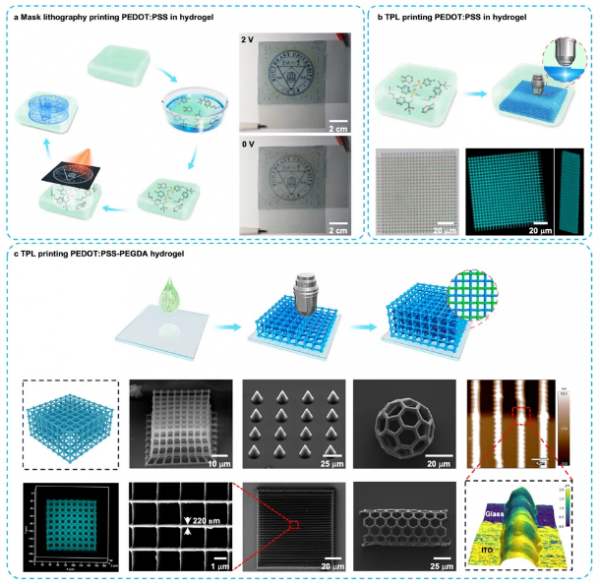 為(wei) 了突破這些技術瓶頸,顧忠澤教授團隊與(yu) 謝勁教授、韓傑副研究員團隊提出了一種基於(yu) 時空可控光誘導氫原子轉移(HAT)反應的導電聚合物光聚合方法。他們(men) 開發了一種高效的HAT催化劑BPED,通過光引發雙重HAT反應,實現了導電聚合物的快速光聚合。以PEDOT:PSS為(wei) 例,標準反應體(ti) 係使用3,4-乙烯二氧噻吩為(wei) 單體(ti) ,聚苯乙烯磺酸鈉為(wei) 對陰離子,Irgacure 2959為(wei) 光引發劑,對甲苯磺酸(TsOH)為(wei) 摻雜劑。在空氣中,15分鍾內(nei) 可完成聚合反應。由於(yu) Irgacure 2959和BPED都具備優(you) 異的雙光子吸收性能,該反應促成了PEDOT:PSS結構的雙光子打印。在固化的水凝膠中,該方法能夠打印三維PEDOT:PSS導電通路。更進一步,該技術可以同時引發了水凝膠前體(ti) 的自由基聚合交聯和EDOT的聚合反應,從(cong) 而構建出亞(ya) 微米分辨率且可編程的三維導電微納結構。該創新性的光聚合方法有效解決(jue) 了3D打印中導電聚合物的兼容性和光吸收問題。