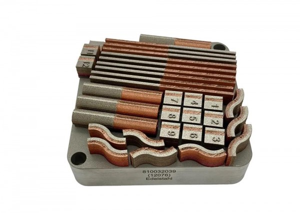 一款采用SLM技術打印的一體(ti) 化鋼-銅散熱器,由高導熱係數銅合金和結構材料製成的多材料部件在熱管理方麵具有廣泛的應用。熱交換器和冷卻元件常用於(yu) 數據中心、汽車、化學工業(ye) 、燃燒裝置、模具、鑲件等。對於(yu) 注塑行業(ye) 來說,冷卻時間的縮短可以加快整個(ge) 生產(chan) 周期。對於(yu) 較小的模具鑲件,隨形冷卻通道的空間非常有限,因此在鑲件內(nei) 部使用銅材料成為(wei) 加速散熱的唯一方法。