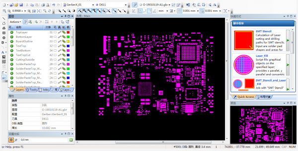 CircuitCAM7 Stencil庫功能、幾何圖形操作功能與(yu) 友好的操作界麵相結合,具備了自動數據處理的特征。比如,一鍵輸出多類文件,不受某層關(guan) 閉影響,提高效率;自動檢測多孔、漏孔,免除錯、漏操作;自由快捷鍵定義(yi) ,數據瀏覽、查看、定位等功能,方便實用。
