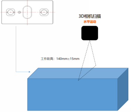 一套 3D 相機安裝在運動軸上,進行壓裝高度、間隙檢測;沿產(chan) 品長邊中間區域運動掃描檢測。
