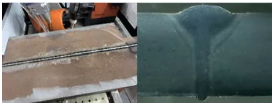 在傳(chuan) 統的船板拚焊中,一般采用埋弧焊或者氣保焊。傳(chuan) 統的埋弧焊無法實現單麵焊雙麵成形,在正麵焊接完成後,需要翻麵工序,再次進行背麵焊接。拚焊的船舶麵積大,板材厚度大,因此,翻麵需要專(zhuan) 用設備,價(jia) 格高,使用過程具有一定的危險性。為(wei) 避免船舶平麵分段生產(chan) 製造的危險,國外船舶製造公司特別是歐洲部分船舶製造公司,先後引入了激光電弧複合焊工藝及裝備。激光電弧複合焊焊縫形態如圖2 所示。