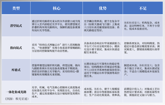 四代激光通信終端對比圖:總體(ti) 來講,一體(ti) 化集成光路激光通信終端在成本、體(ti) 積和重量方麵都達到了最小,適應大規模組網衛星應用,但相應的集成工藝要求較高、設計難度也較大。