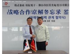 18日,韓國培耘電子公司與(yu) 中國佛山市國星光電股份有限公司簽訂《戰略合作諒解備忘錄》,將在LED照明戰略技術方麵進行合作。圖為(wei) 培耘電子公司代表理事安槿駿(右)與(yu) 佛山市國星光電股份...