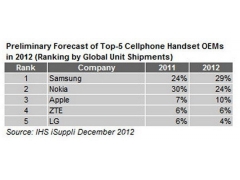 據CENT網站報道,據市場研究公司IHS日前發表研究報告稱,預計2012年全年手機出貨量方麵三星將占全球整個(ge) 手機市場份額的29%,超越占據市場第一長達14年的諾基亞(ya) ,將成為(wei) 全球最大的手機廠商...