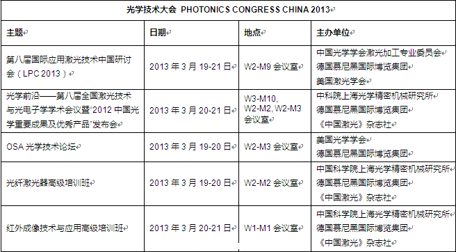 亞(ya) 洲領先的光學技術大會(hui) PHOTONICS CONGRESS CHINA將於(yu) 2013年3月19-21日再次與(yu) 慕尼黑上海光博會(hui) 同期舉(ju) 辦。PHOTONICS CONGRESS CHINA議題豐(feng) 富,主題包括激光加工、先進激光器、光學技術、再生能源等最新研發成果和進展,全麵覆蓋多個(ge) 激光和光電子領域。大會(hui) 和慕尼黑上海光博會(hui) 一起將科學、研發和產(chan) 業(ye) 應用緊密結合,賦予科研生產(chan) 更多獨特的實用價(jia) 值。2012年光學技術大會(hui) 共吸引了1,266名聽眾(zhong) 蜂擁到場與(yu) 會(hui) 聆聽。