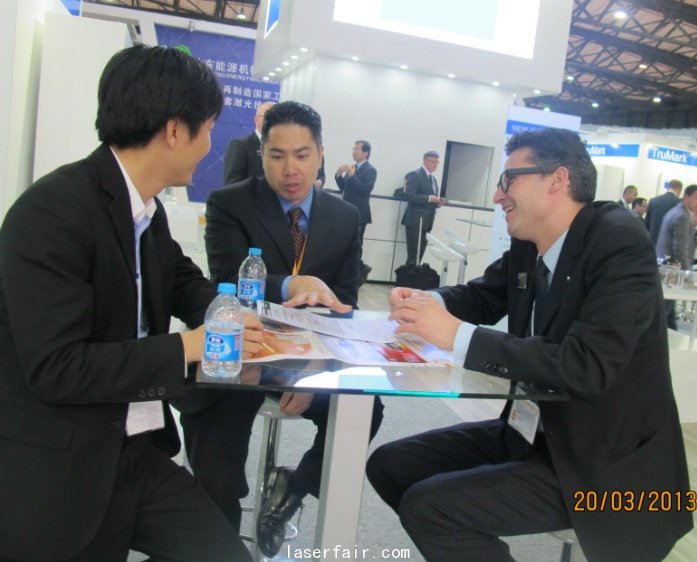 通快(中國)公司市場推廣總監Markus Lindemann與(yu) 《激光製造商情》副總編邵火洽談