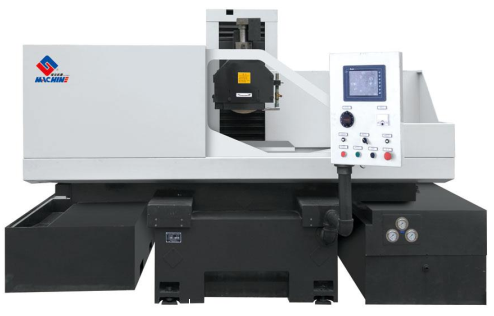 特點如下:砂輪主軸采用德國進口精密角接觸球軸承,剛性好,精度高,磨削工件的表麵粗糙度低。工作台導軌粘貼聚四氟乙烯導軌軟帶,耐磨性好,使用壽命長。工作台往複運動采用獨立液壓站驅動,經比例閥無級調速,實現快、慢速平穩運動,油站設有油冷卻裝置,係統油溫及溫升小。工作台(或拖板)橫向移動采用交流伺服電機驅動精密滾珠絲(si) 杆副傳(chuan) 動,可實現微小斷續進給和低速連續運動以精修砂輪,采用液壓-電聯合控製的砂輪修整器,結構新穎,可實現砂輪自動精密修整,以達到工件表麵低粗糙度磨削之用。 磨頭垂直進給采用交流伺服電機驅動精密滾珠絲(si) 杆傳(chuan) 動,與(yu) 精密滾針交叉導軌副配合使用,進刀靈敏度高。整機設計參照歐洲標準,造型美觀,安全性高:工作台防護罩采用全封閉結構,外形美觀,操作安全;磨頭砂輪防護罩具有開門斷電功能,安全性高。機床采用自行設計的專(zhuan) 用磨床數控係統,設有手動磨削和全自動磨削等功能;自動磨削時隻需在操作界麵上將磨削參數設定好之後,即可實現磨頭自動進給、砂輪自動修整及自動補償(chang) 等程序,操作十分方便。機床設有故障自動報警功能,故障原因顯示在報警屏“監控屏”內(nei) ,非常直觀。