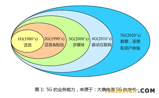 移動通信經曆了從第一代移動通信係統(1G)到第四代移動通訊係統(4G)的發展,曆代移動通信係統都有其典型業務能力和標誌性技術。例如:1G的模擬蜂窩技術,2G以時分多址(TDMA)和頻分多址(FDMA)為主的數字蜂窩技術,都以電路域話音通信為主;3G以碼分多址(CDMA)為主要特征,支持數據和多媒體業務;4G以正交頻分複用(OFDM)和多入多出(MIMO)為主要特征,支持寬帶數據和移動互聯網業務。近年來,集成電路技術快速發展,通信係統和終端能力極大提升,通信技術和計算機技術深度融合,各種無線接入技術逐漸成熟並規模應用。可以預見,對於未來第五代移動通信技術(5G),不能再用某項業務能力或者某個典型技術特征來定義。