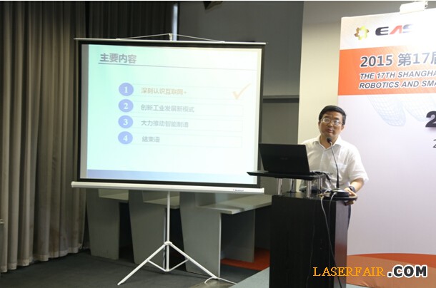 7月14日展會開幕首日,在“2015智能製造及智能工廠實施高峰論壇“上,中國機械工業聯合會顧問 原國家機械工業部總工程師 朱森第發表了題為“智能製造—— 《中國製造2025》的主攻方向 ”的演講。他強調了推進智能製造的重點行動,如建立協同推進智能製造聯合體,包括整體解決方案、ERP、MES、精益生產、工藝研究、工業機器人、智能裝置等提供商,對大批量生產、多品種小批量、單件生產、流程型製造等不同生產方式開展不同示範項目,不同工藝、不同工序的實現自動化生產的技術路線與途徑以及根據不同行業製訂智能製造總體方案。
