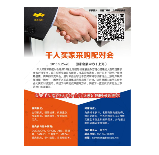 第18屆上海國際機床展特別推出的大型商貿對接平台千人買(mai) 家采購配對會(hui) 自2016年6月4日上線以來,在業(ye) 內(nei) 受到極大關(guan) 注,並且以其高效