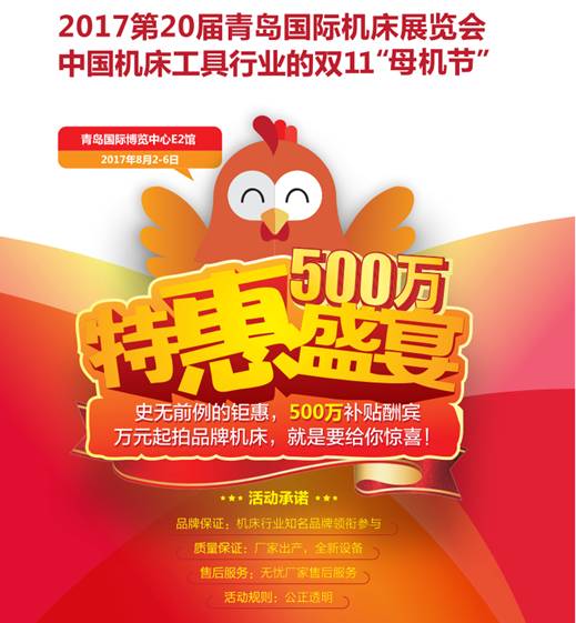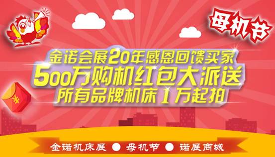 金諾機床展母機節已經連續舉辦了2年,值此青島國際機床展20歲生日之際,為答謝長期以來連年不斷地關注、支持、參觀和采購的專業買家,金諾“母機節”火爆開啟;今年的母機節組委會別出心裁,開創中國機床工具行業拍賣的先河,聯合部分合作商以拍賣的形式把參展展品以最大限度的底價讓利給專業買家,並且拍賣的設備有品牌保證、質量保證、售後保證,讓專業買家享受無憂購機;競拍和采購成功的買家還可以參與現場iphoness7、冰箱和彩電的大抽獎,屆時母機節全場將打造競拍歡呼的海洋。