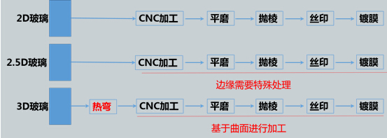2D和2.5D玻璃防護屏產品的生產方法是將玻璃基板進行切割,通過精雕、光孔、拋光、強化、絲印、鍍膜等加工後,製成各種規格型號的產品。3D曲麵玻璃的生產流程與2D和2.5D產品基本相同,最大區別在於新增熱彎成型設備。