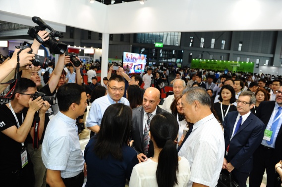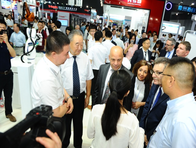 圖為CIROS2017現場中國機械工業聯合會會長王瑞祥巡館