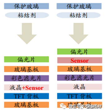 圖6:In-cell(左)和On-cell(右)內(nei) 嵌式觸控技術結構示意圖