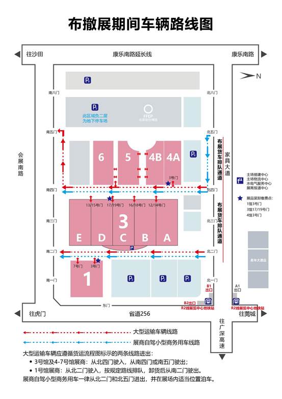 1、從(cong) 廣州、深圳自行來東(dong) 莞的觀眾(zhong) /客商可經廣深高速公路厚街立交出口,沿S256省道(原107國道)或博覽大道直達展館。