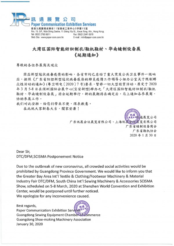 有關(guan) 大灣區紡織製衣、鞋機鞋材、華南縫製設備展延期通知