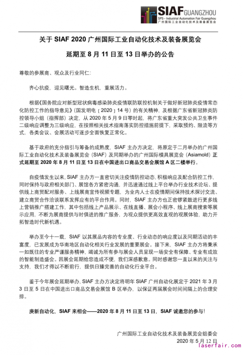 廣州光亞(ya) 法蘭(lan) 克福展覽有限公司董事長杜承華先生代表主辦方表示:“ 在與(yu) 業(ye) 內(nei) 的合作夥(huo) 伴協商後,我們(men) 很高興(xing) 為(wei) SIAF和Asiamold確立了新的展會(hui) 日期。我們(men) 相信現在是一個(ge) 重要時機,通過SIAF和Asiamold,我們(men) 將致力為(wei) 工業(ye) 自動化技術及模具領域提供有效的平台,從(cong) 而幫助行業(ye) 複蘇。”他續說:“我們(men) 也會(hui) 竭盡所能,為(wei) 所有業(ye) 內(nei) 人士提供一個(ge) 安全的展會(hui) 環境。我們(men) 稍後將會(hui) 公布更多相關(guan) 的防疫措施。”