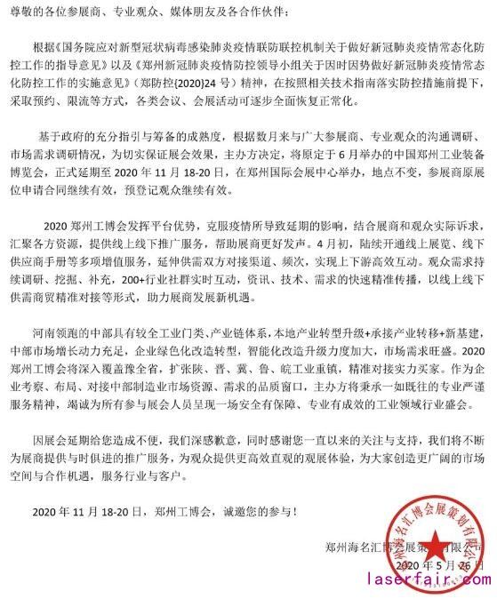 隨著經濟社會(hui) 生活逐步趨向正常化,2020鄭州工博會(hui) 整裝出發。作為(wei) 企業(ye) 考察、布局、對接中部製造業(ye) 市場資源、需求的品質窗口,展會(hui) 將進一步提升服務水平,提高企業(ye) 參展收益,對接實力買(mai) 家,為(wei) 參展商搭建綜合性營銷服務平台,2020年第16屆鄭州工博會(hui) 將於(yu) 11月18-20日(新時間),鄭州國際會(hui) 展中心(老地點)如期而至。